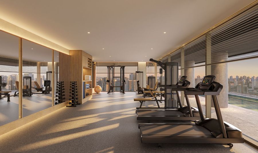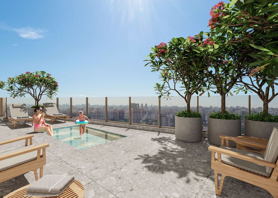 Projeto com lazer a 26 metros de altura, no 8º andar, com piscina adulto com raia de 25 metros, lounge com espreguiçadeiras, piscina infantil, fitness e brinquedoteca.